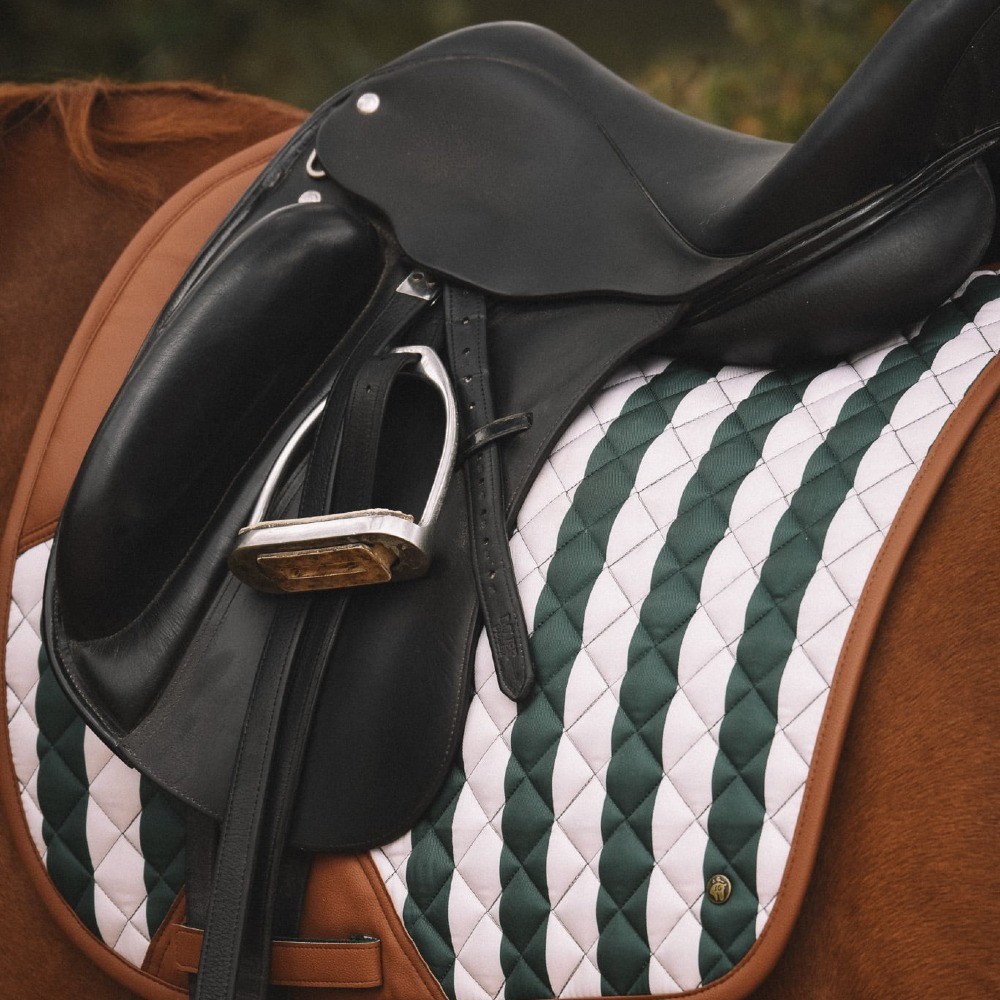 Dostępny od maja 2026 Ten czaprak to stylowy i trwały wybór zarówno do codziennego użytku, jak i na zawody. Posiada oddychające warstwy z podszewką z siateczki odprowadzającej wilgoć. Dzięki solidnej lamówce z wegańskiej skóry czaprak pewnie trzyma się na miejscu, nie zsuwając się ani nie marszcząc pod siodłem.