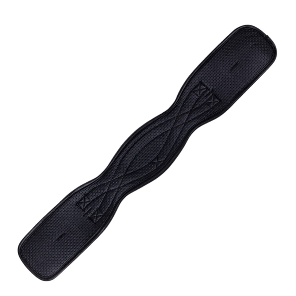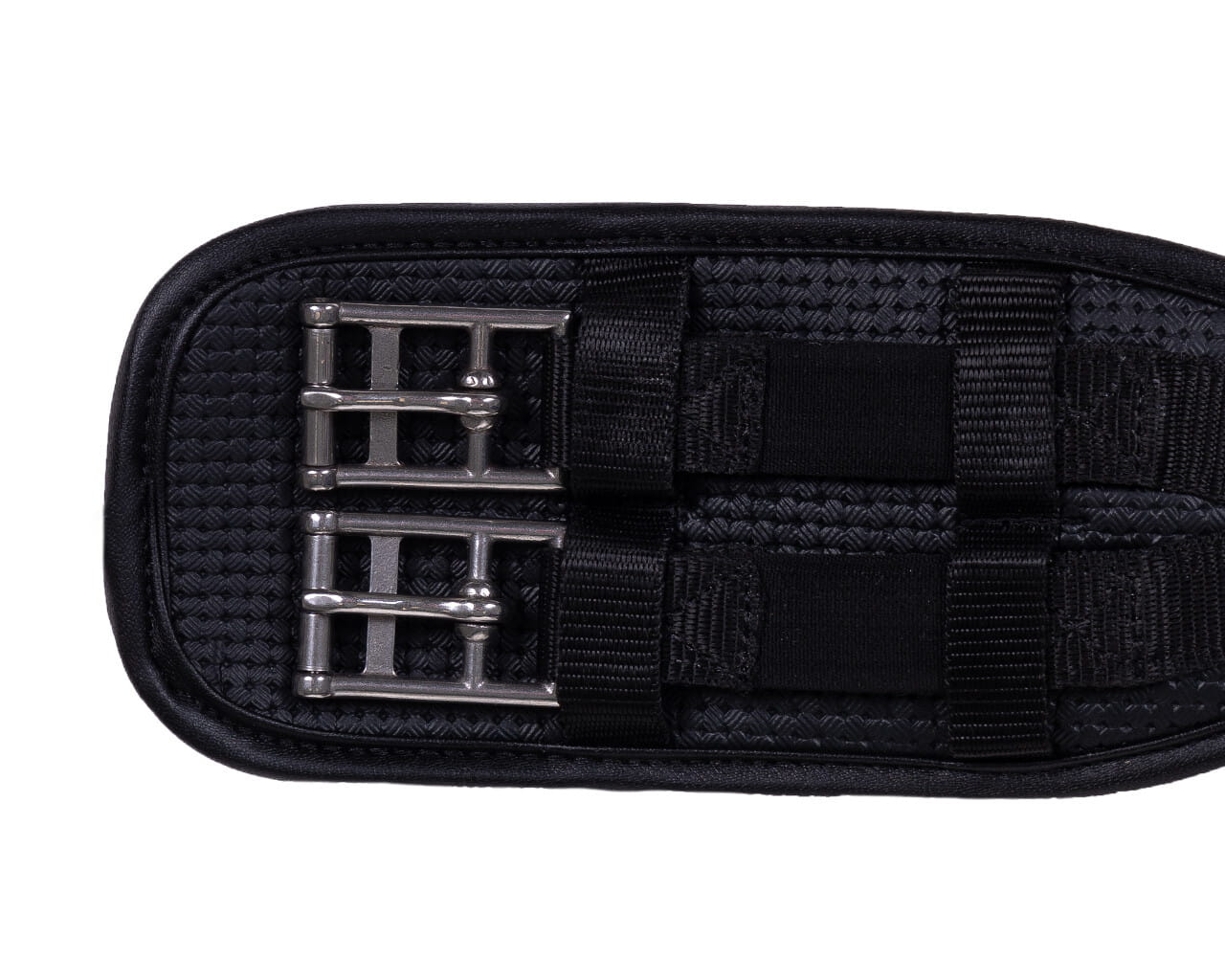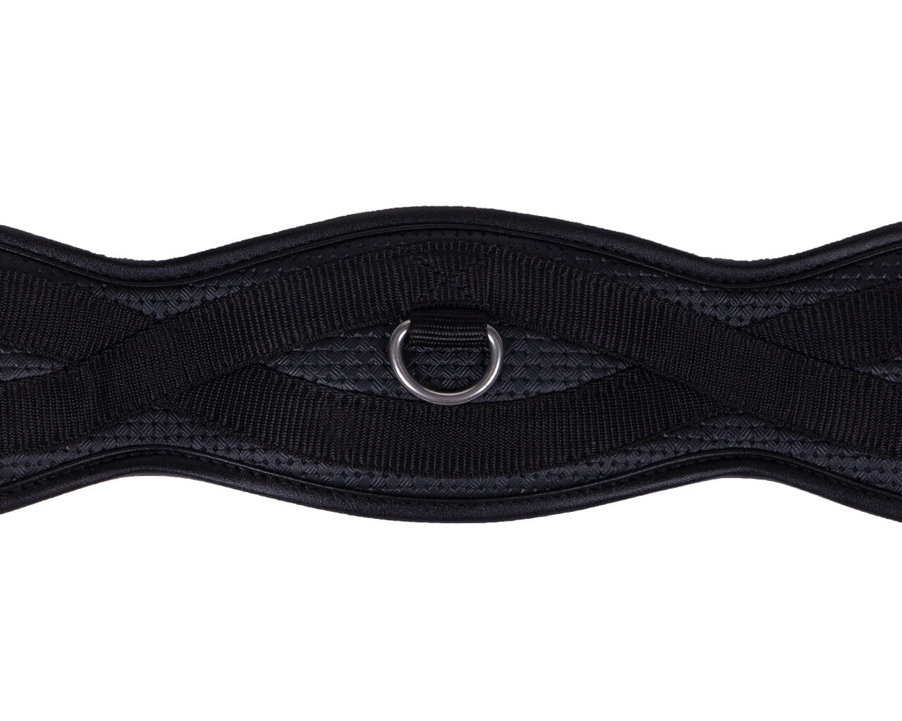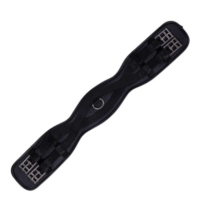 Elegancki, czarny popręg ujeżdżeniowy wykonany z mocnego materiału. Anatomiczny kształt popręgu zapewnia większy komfort i swobodę ruchów. Popręg posiada kółko pośrodku do mocowania pomocy treningowej.