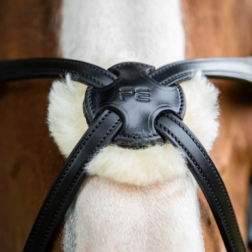 -Wyściełany, profilowany naczółek z okrągłym wypukłym wzorem i broszką z logo „PE” po obu stronach