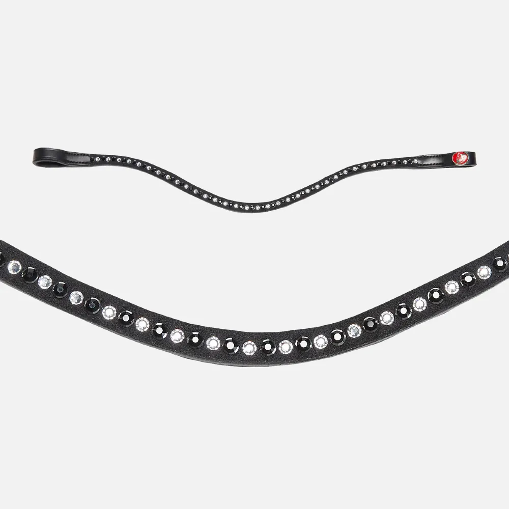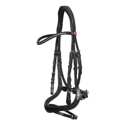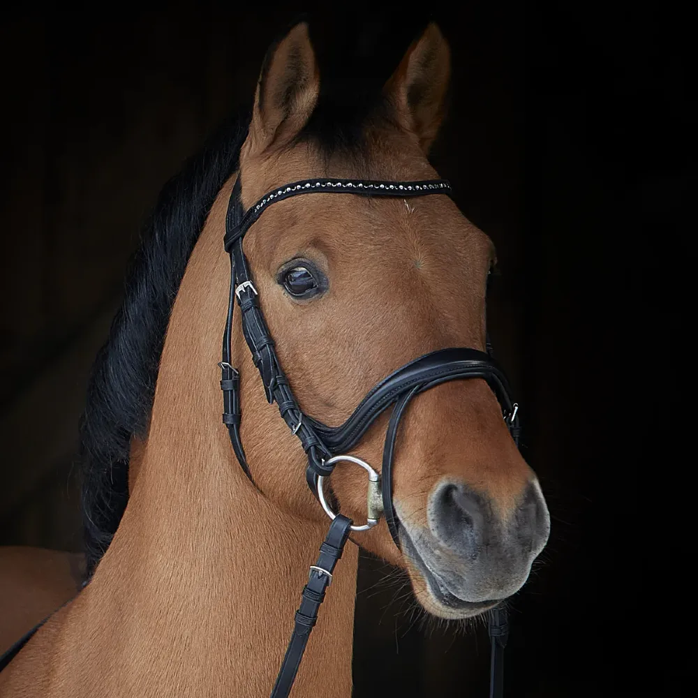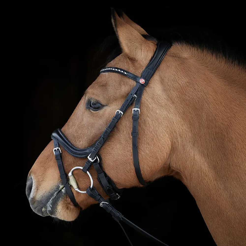 Miękko wyściełany nachrapnik jest anatomicznie zaprojektowany, aby delikatnie rozprowadzać nacisk, unikając nieprzyjemnych szczytów nacisku na wrażliwe nerwy twarzy lub tarcia na kości policzkowej. Dla jeźdźców, którzy wolą ogłowie bez paska krzyżowego, można go zdjąć bez pozostawiania śladu. Ogłowie Ilona jest dostępne z dwoma różnymi opcjami naczółka, oba ozdobione pięknymi kryształkami.
