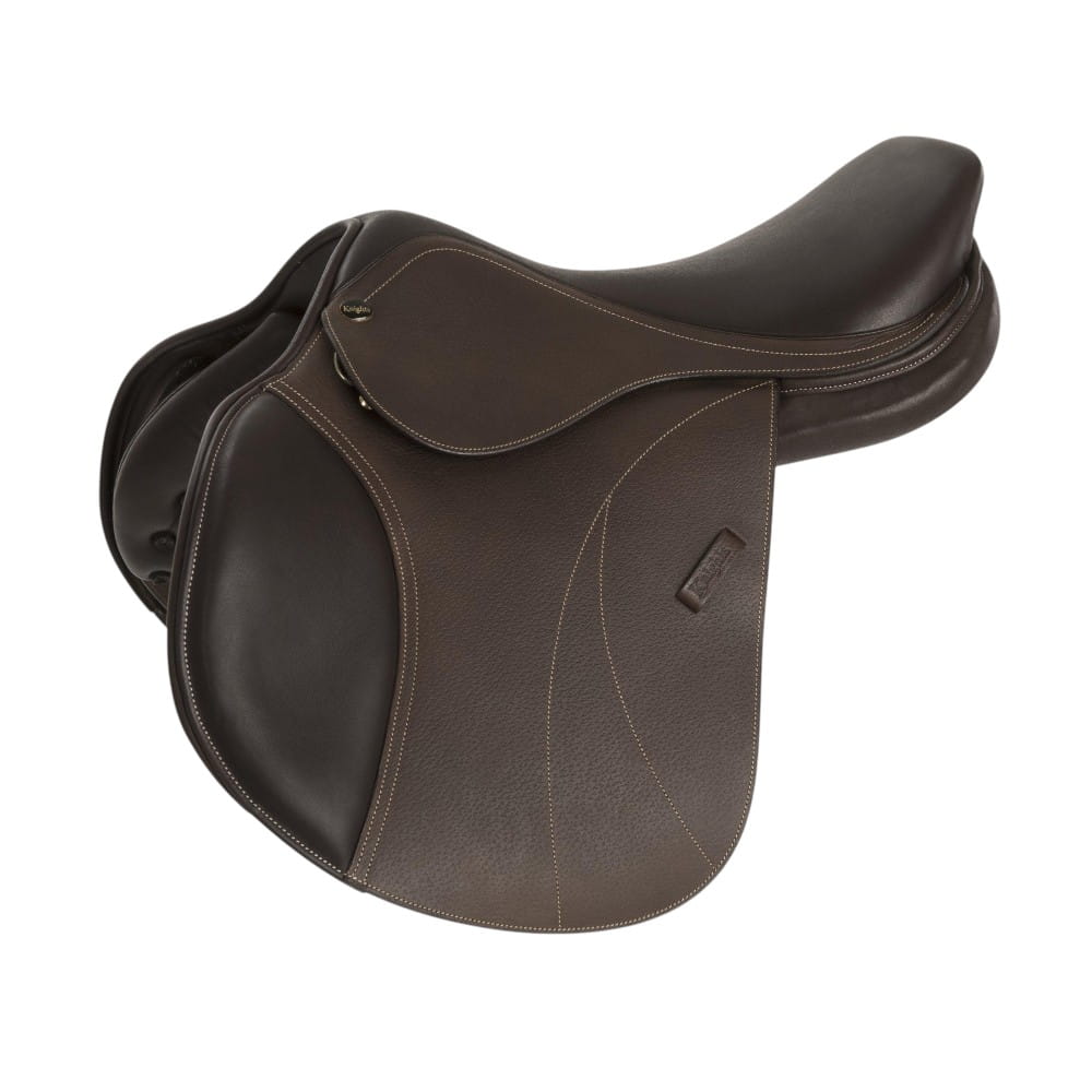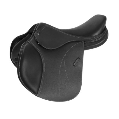 Nowoczesne siodło skokowe z europejskiej skóry. Siedzisko i poduszki kolanowe ze skóry cielęcej. Siodło ma szeroki kanał i wyściółkę WoolFlex, która zapewnia równomierne i delikatne wyściełanie. Klocki kolanowe na rzepy. Syntetyczna terlica z wymiennymi łękami. W zestawie łęk w rozmiarze M.