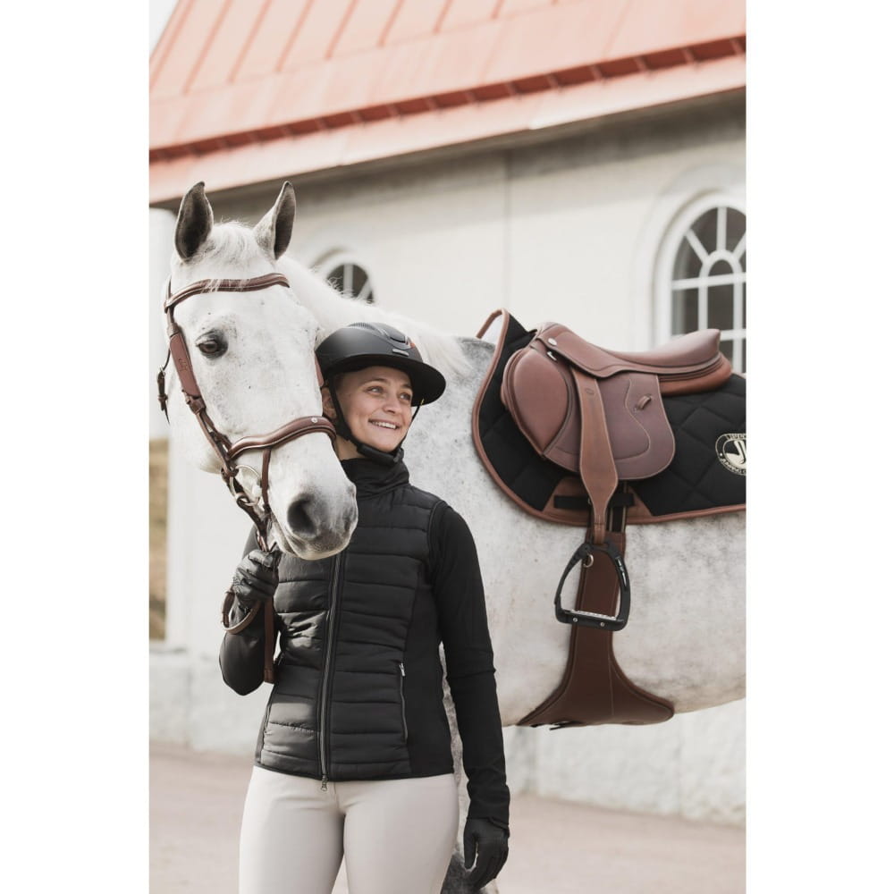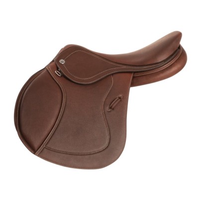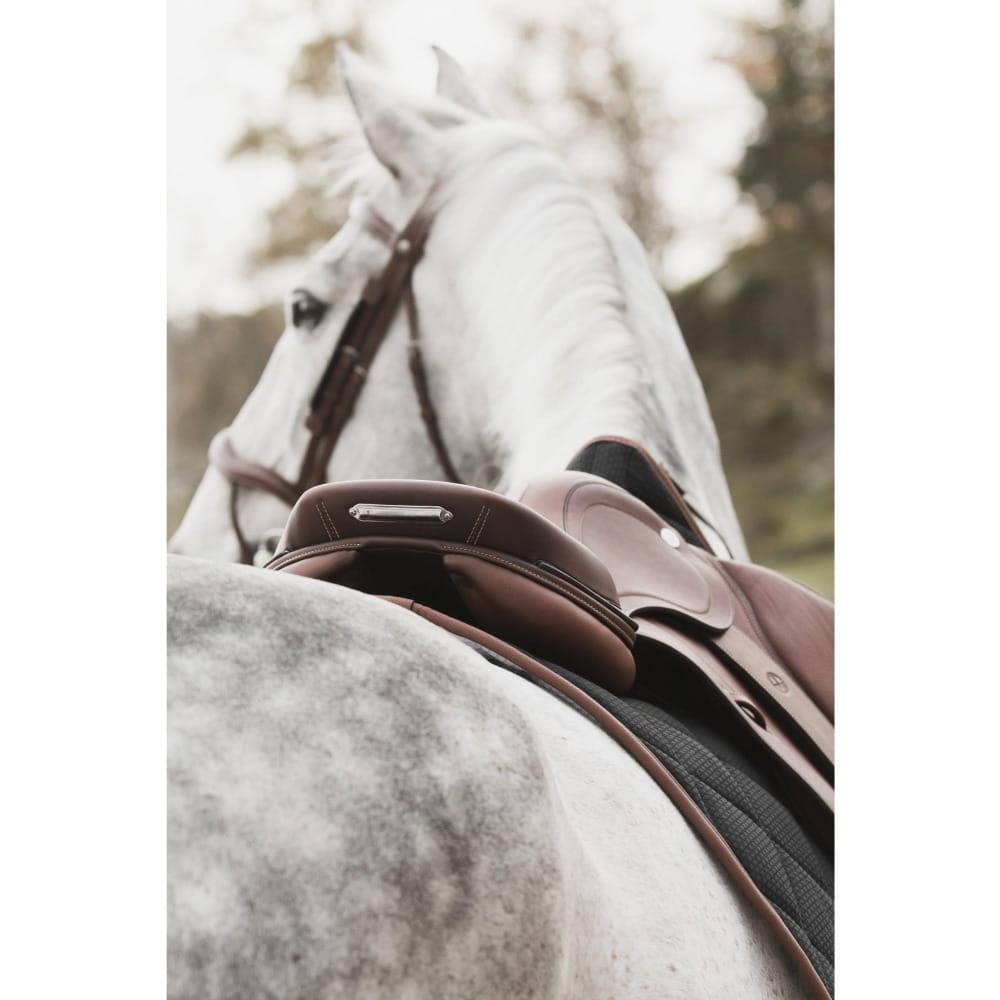 Dobrze wykonane siodło skokowe Close Contact. Siedzisko, tybinki, poduszki kolanowe z włoskiej skóry cielęcej zapewniającej dobrą przyczepność. Przystuły z mocnej europejskiej skóry. Pozostałe elementy z europejskiej skóry. Terlica z wąskim twistem i miękkim siedziskiem. Mocna syntetyczna terlica z wymiennymi łękami. Stylowa i stylowa plakietka na imię w kolorze srebrnym jest dołączona do tylnego łęku.