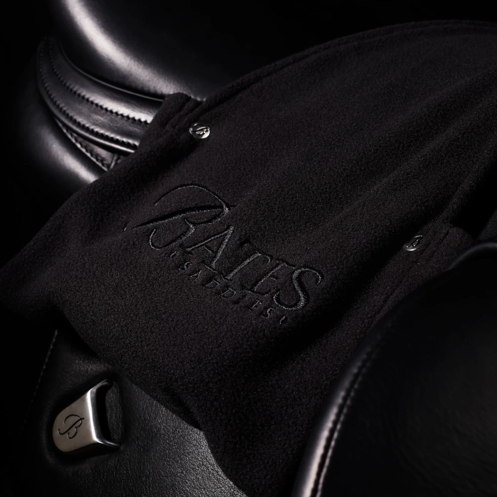Osłona strzemion Bates® zawieszana nad siedziskiem chroniąca skórę siodła, gdy strzemiona nie są używane.