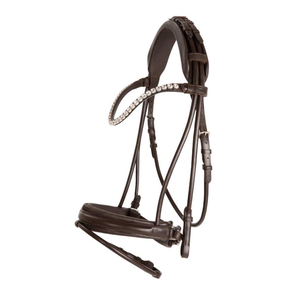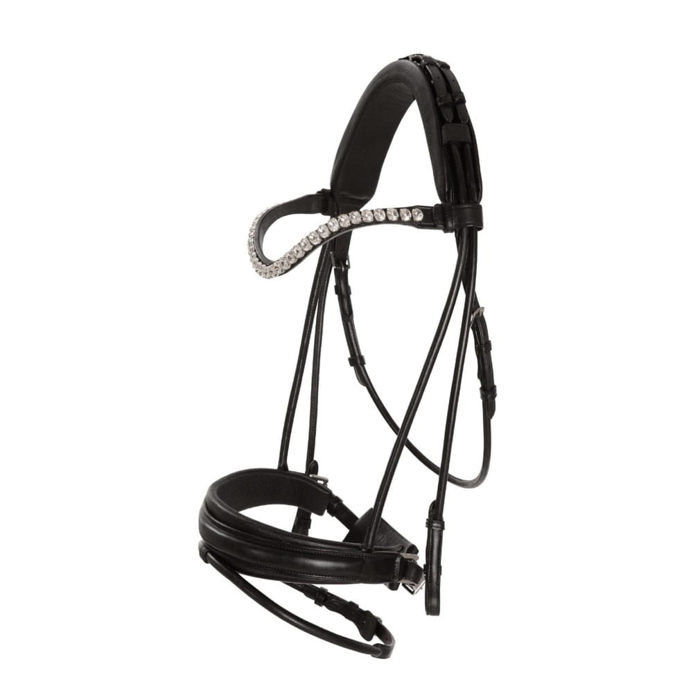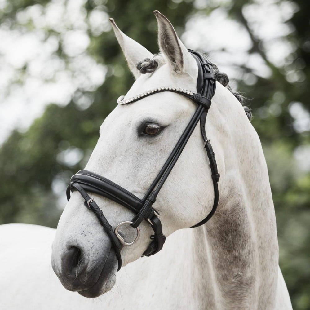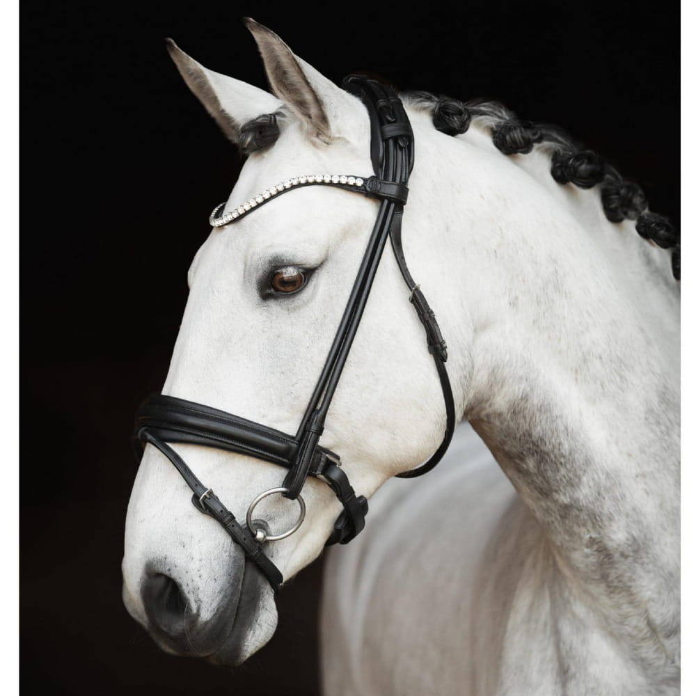 To ekskluzywne i luksusowe ogłowie jest ręcznie wykonane z najwyższej jakości amerykańskiej skóry, z naciskiem na komfort i funkcjonalność. Anatomicznie ukształtowany pasek potyliczny jest obficie wyściełany i całkowicie bezszwowy, aby zapewnić równomierne rozłożenie nacisku na potylicę. Ergonomiczny nachrapnik z miękkiej skóry cielęcej został zaprojektowany bez wewnętrznych szwów. Wygięty naczółek, ozdobiony dużymi, błyszczącymi kamieniami, został umiejscowiony tak, aby odciążyć wrażliwe punkty nerwowe. Dzięki przemyślanej konstrukcji – gdzie naczółek znajduje się między nachrapnikiem a paskami bocznymi – punkty nacisku są zminimalizowane, a dobro konia jest priorytetem. Wyposażone w sprzączki ze stali nierdzewnej