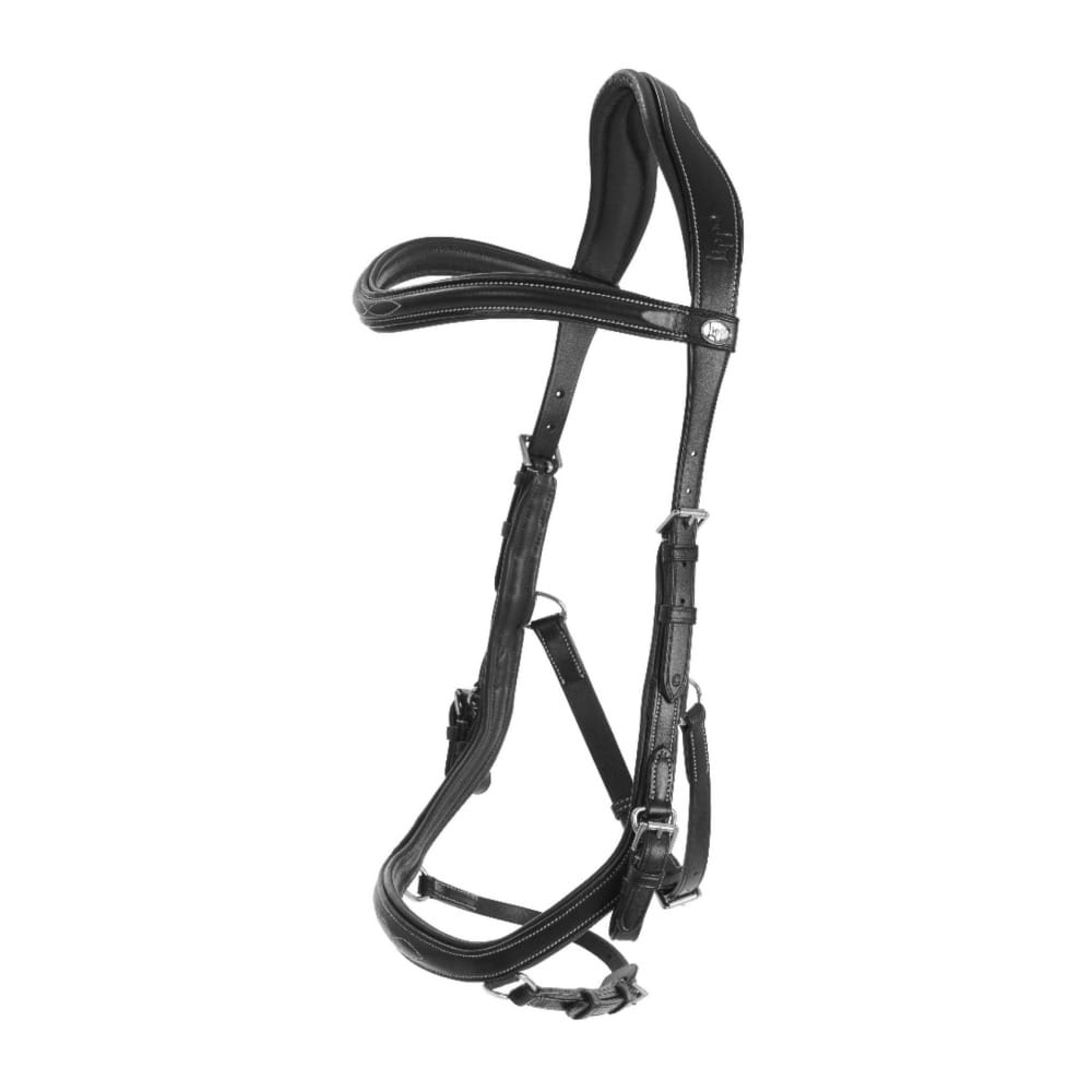 Ogłowie z miękkiej, wysokiej jakości skóry ze srebrnymi sprzączkami. Anatomiczny, podszyty pasek potyliczny. Sprzączki ze stali nierdzewnej.