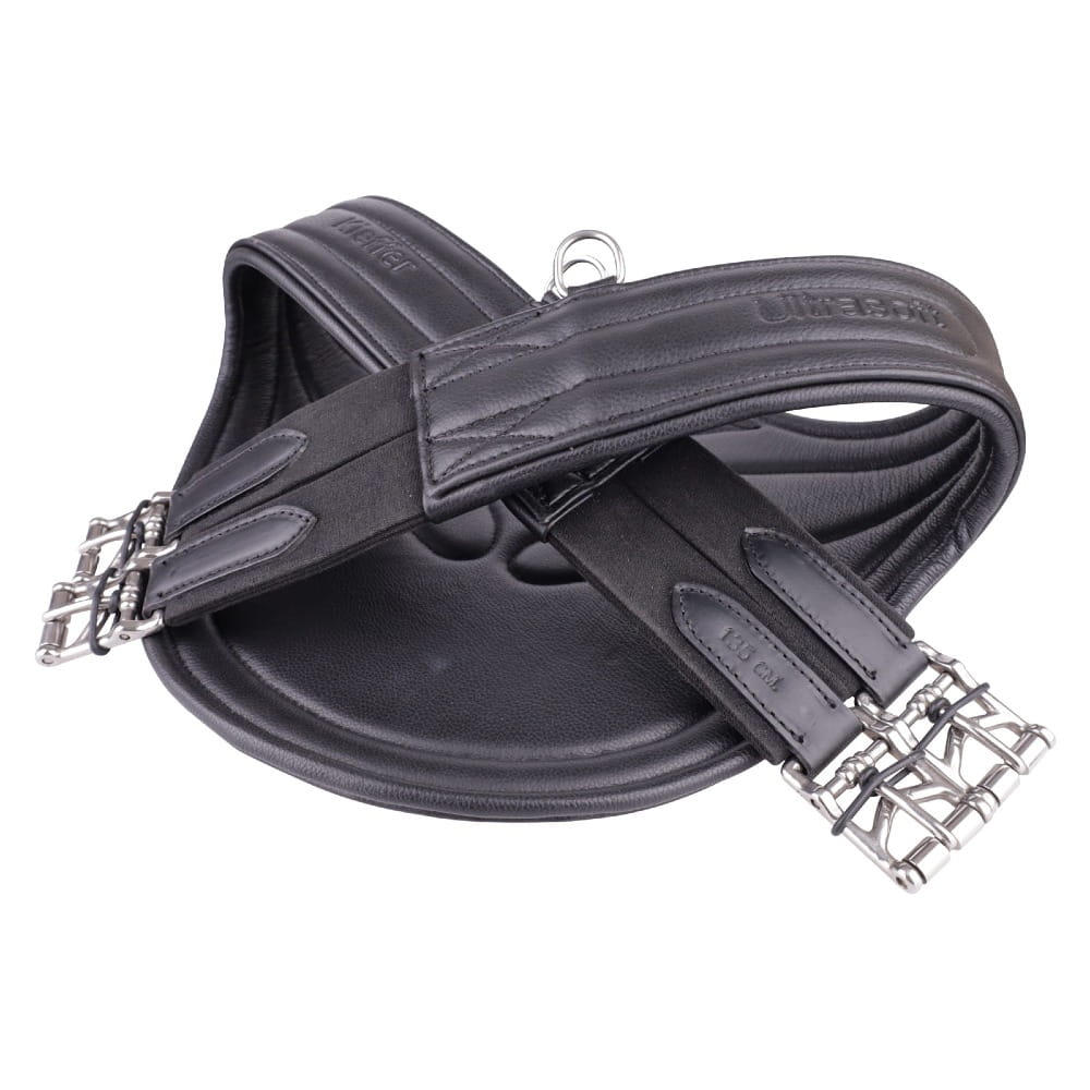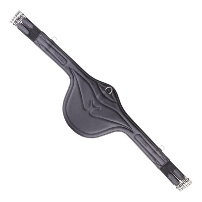 Popręg Belly Guard wykonany ze skóry z miękko wyściełanymi zabezpieczeniami w postaci ćwieków, elastycznymi wstawkami po obu stronach, kółkami do dodatkowych wodzy i centralnie mocowanym karabińczykiem do napierśnika.